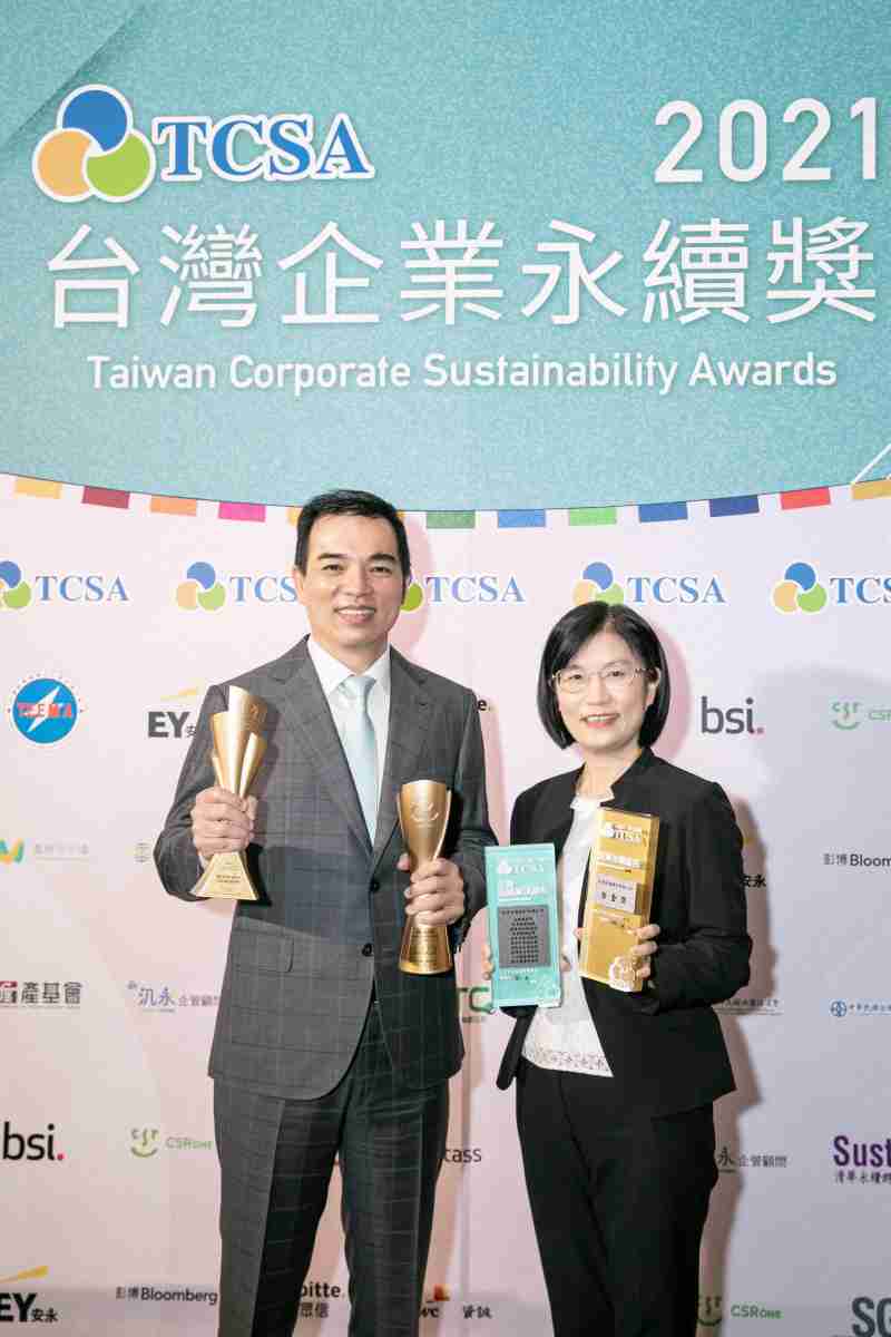 达在台湾永续奖所评比环境、、社会、、、、治理等各面向的永续绩效均获高度肯定 (左:william威廉中文官网光电总经理暨营运长柯富仁,,右:william威廉中文官网光电永续长古秀华)