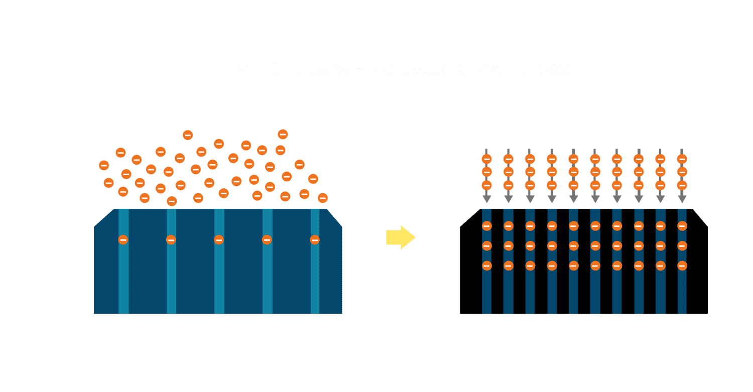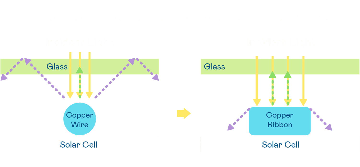 • 电池使用多条铜导线 (Copper wire) 于电池片上形成较短的电流路径,,,提高电流收集效率,,,,采用圆形设计的铜导线较传统扁平式的铜焊带 (Ribbon),,可增加入射至电池的光线量。。。
