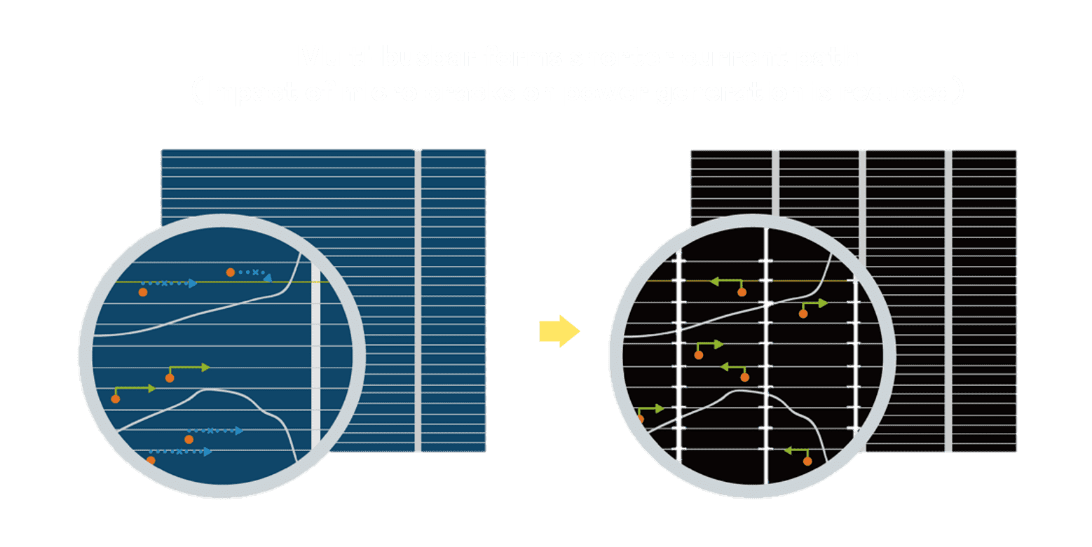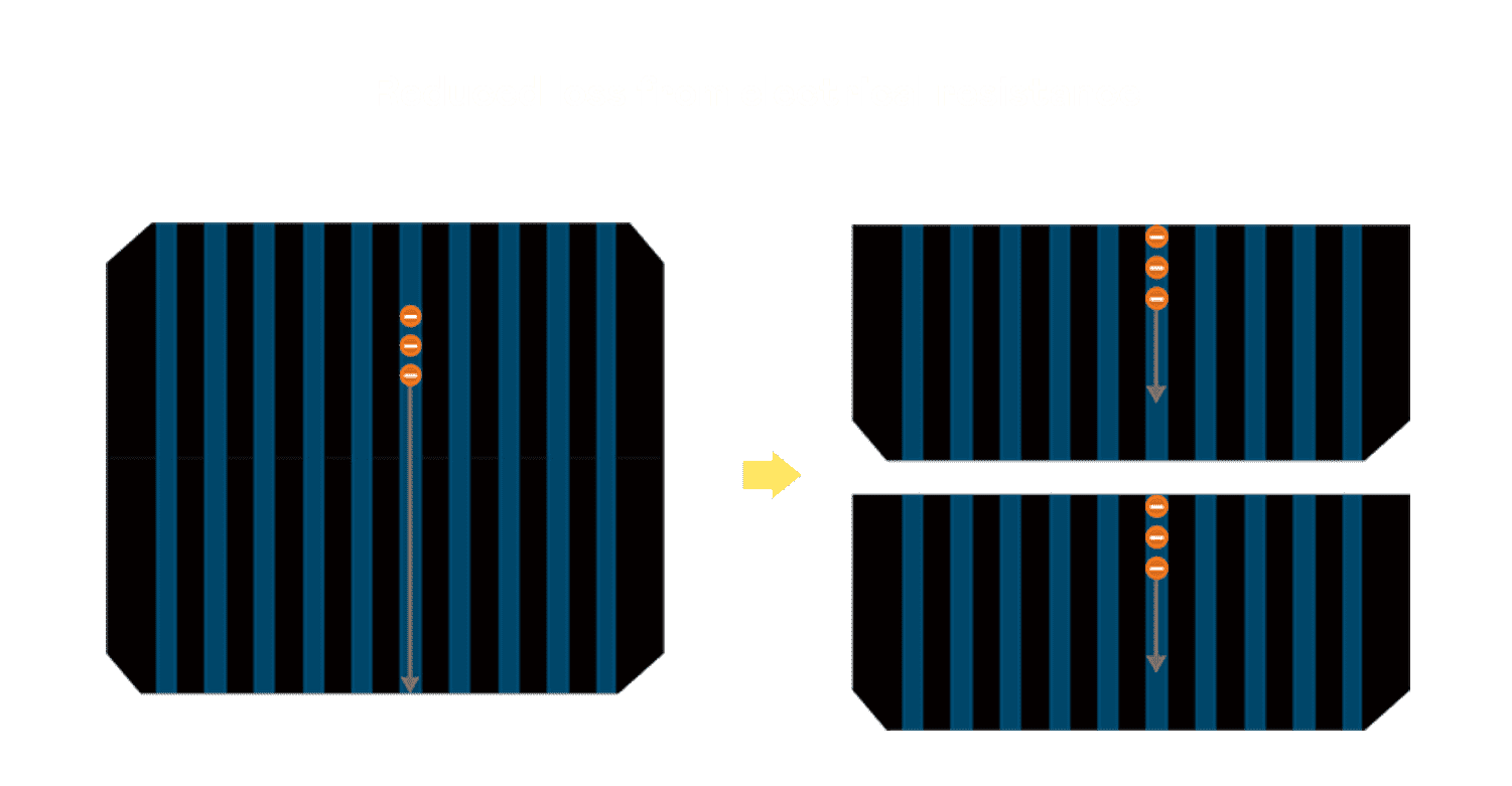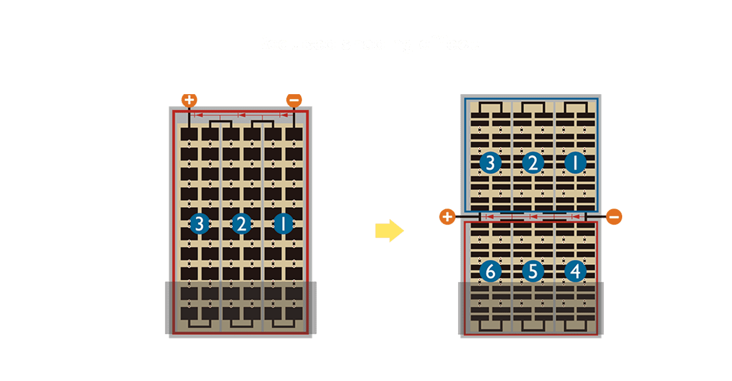 • 结合半切电池,,降低遮阴影响、、提升模组抗隐裂能力、、、、并减少电阻损耗,,,进一步提升模组发电效能。。
